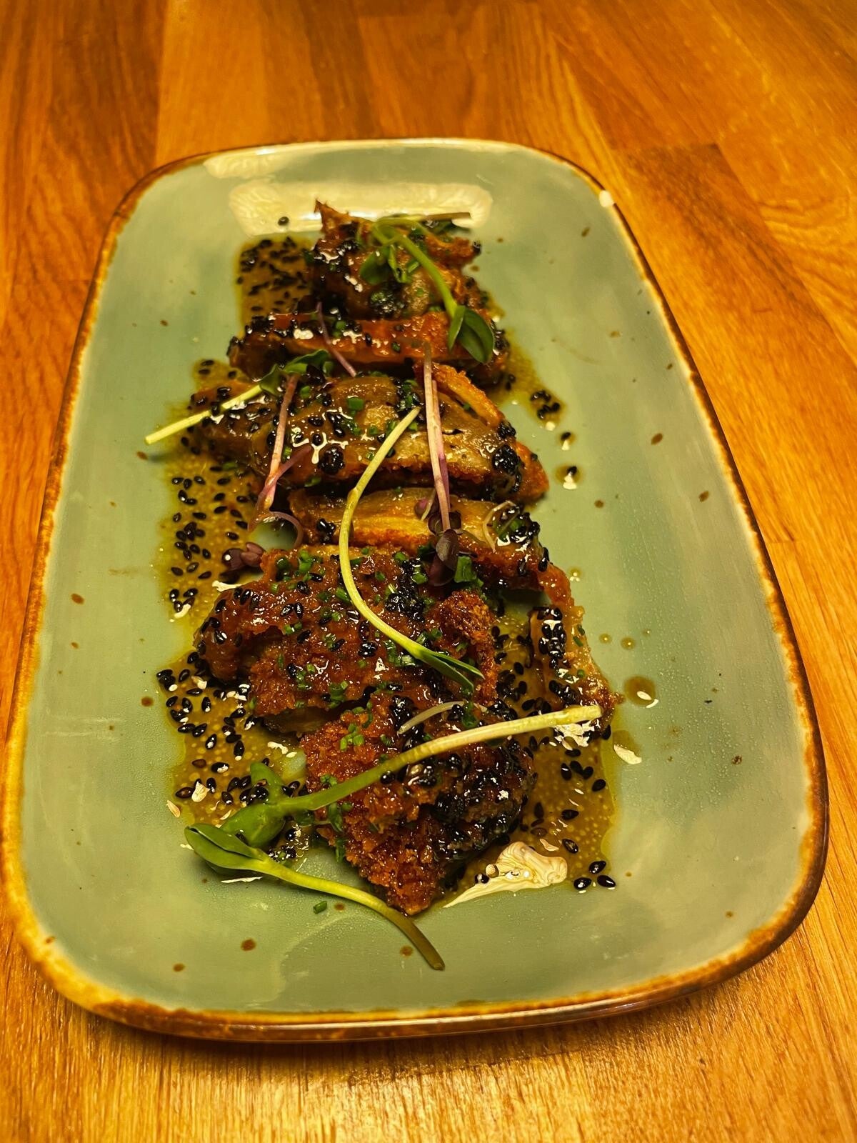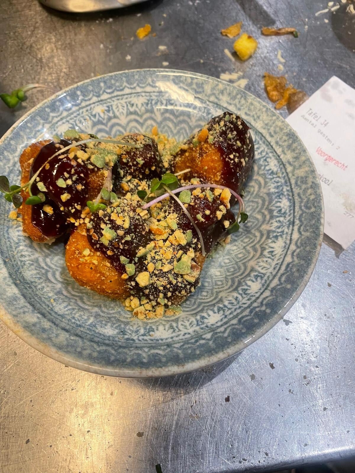 Kipgyoza met hoisinsaus, rode peper en chres.