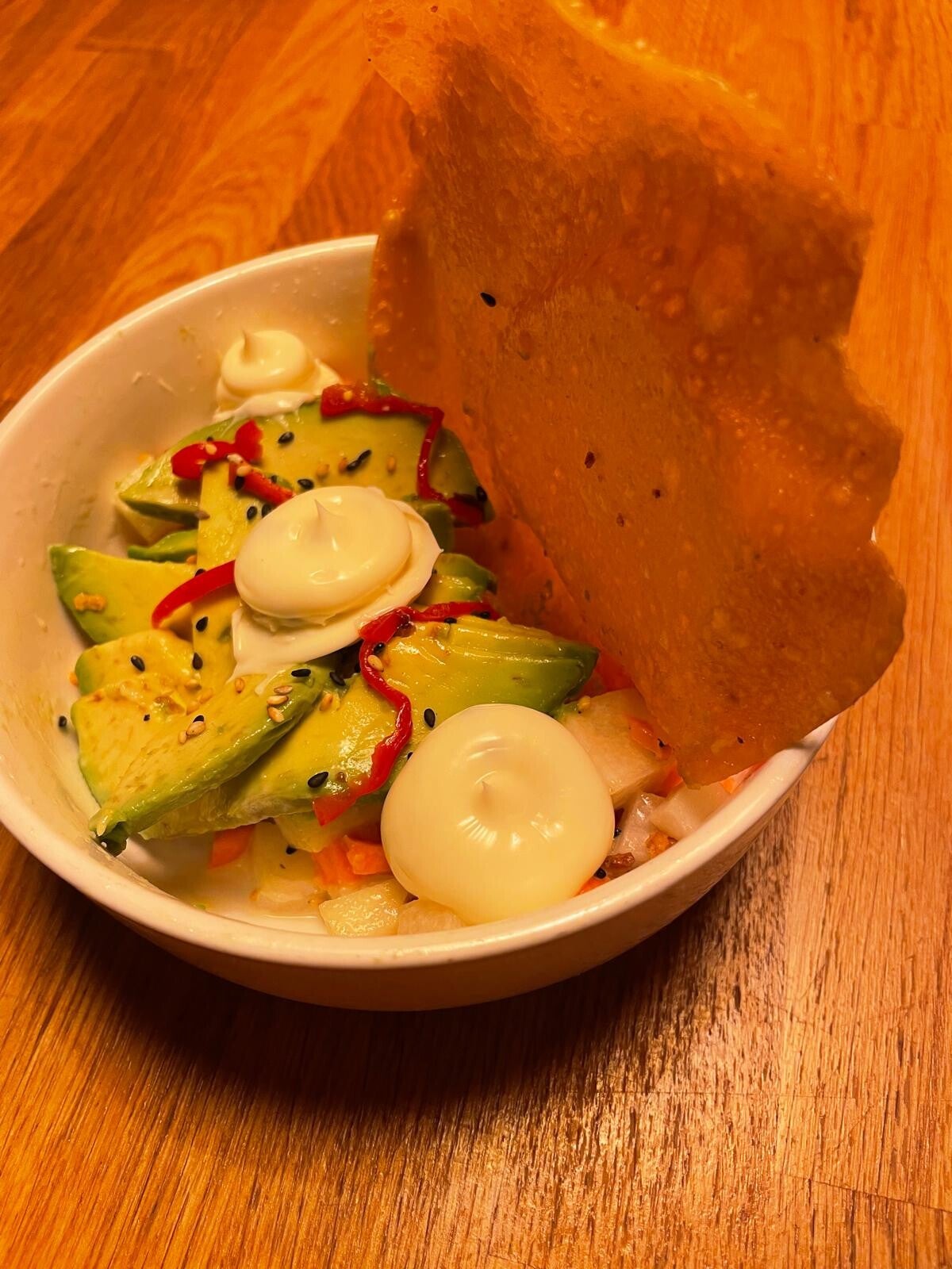 Avocado, retich blokjes, wortel blokjes, krokante Chinese pannenkoek, sesam dressing, sesam zaadjes