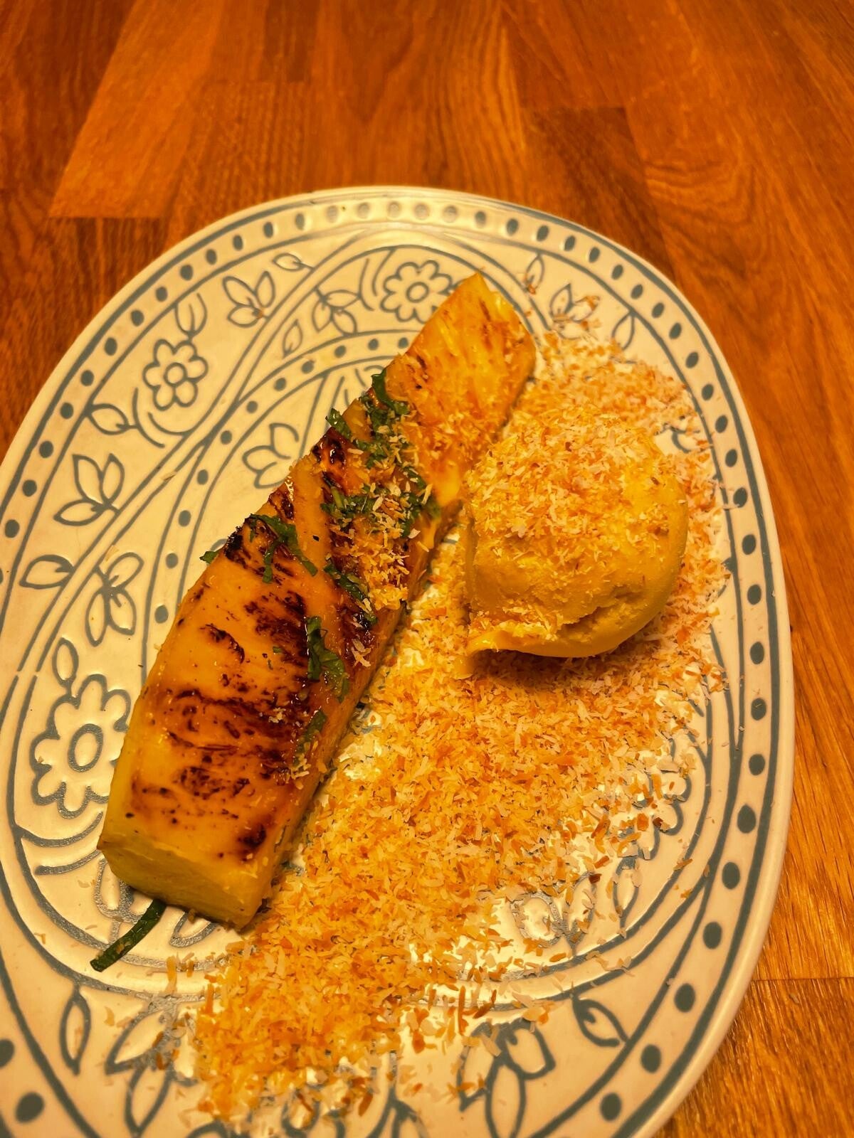 aardbeien, rood fruit saus, mango sorbet ijs, vanille ijs, slagroom, mini spekjes gebrand